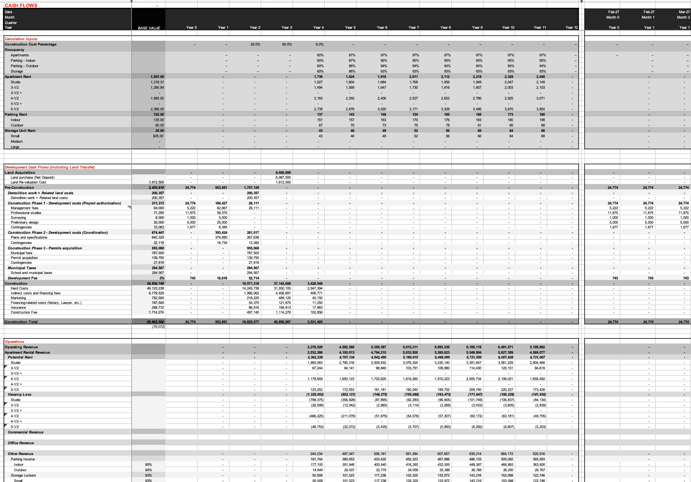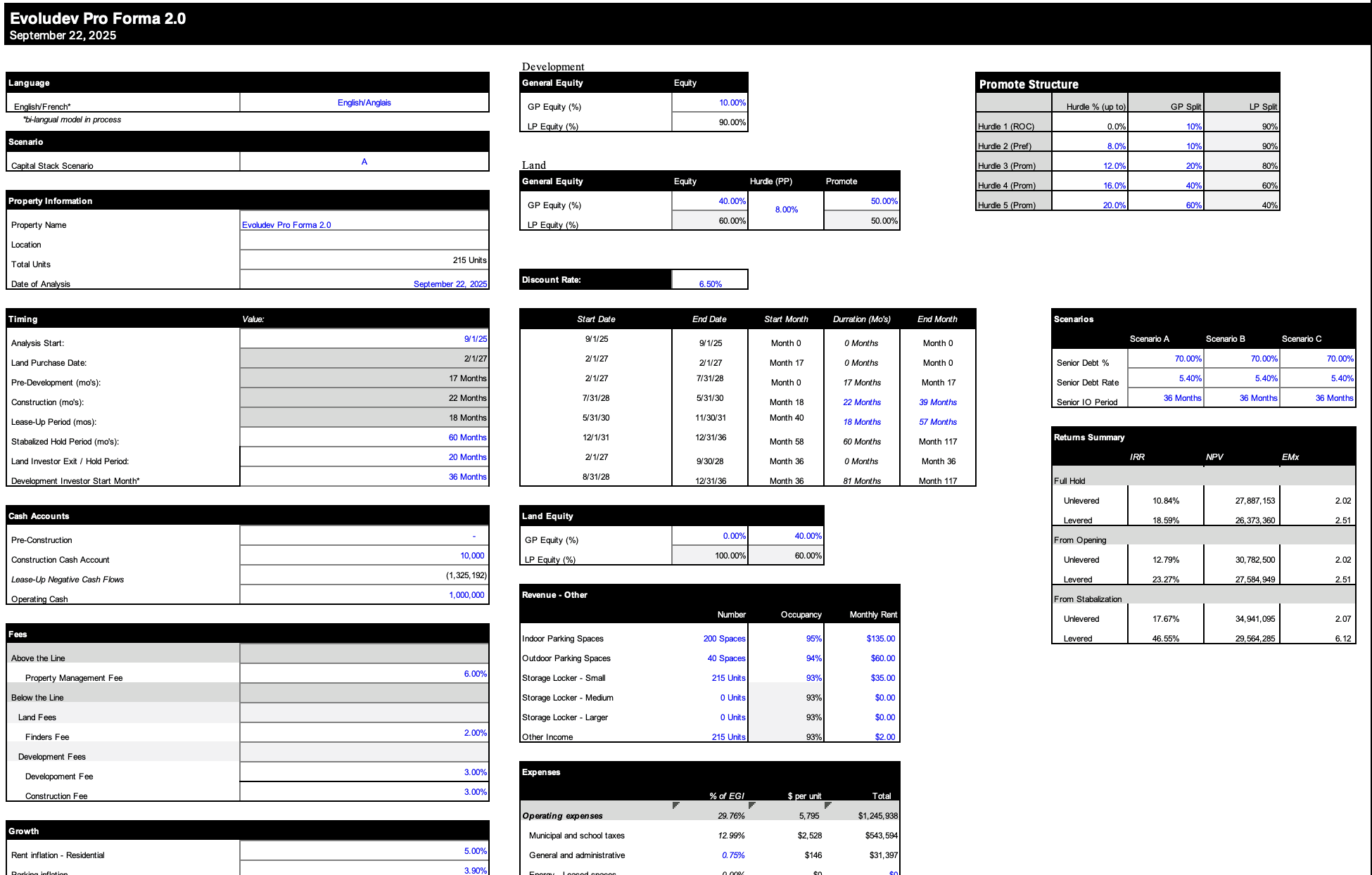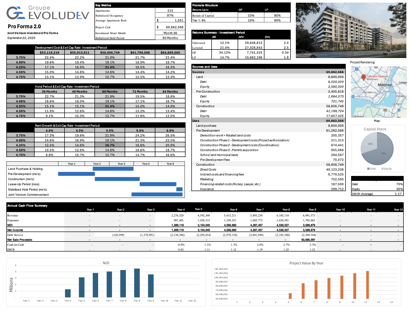 Evoludev came to us with a clear vision for their next phase of growth. As institutional capital entered their markets — and their own pipeline scaled to match — they needed a truly institutional-grade underwriting platform built around how they actually operate: their deal structure, their CMHC financing strategy, their separate land entity, their IRR-driven waterfall, and their sustainability advantage. The model needed to work in both French and English, meet the due diligence standards of international capital sources, and present every dimension of the investment thesis with the same precision as any global operator in the market.
