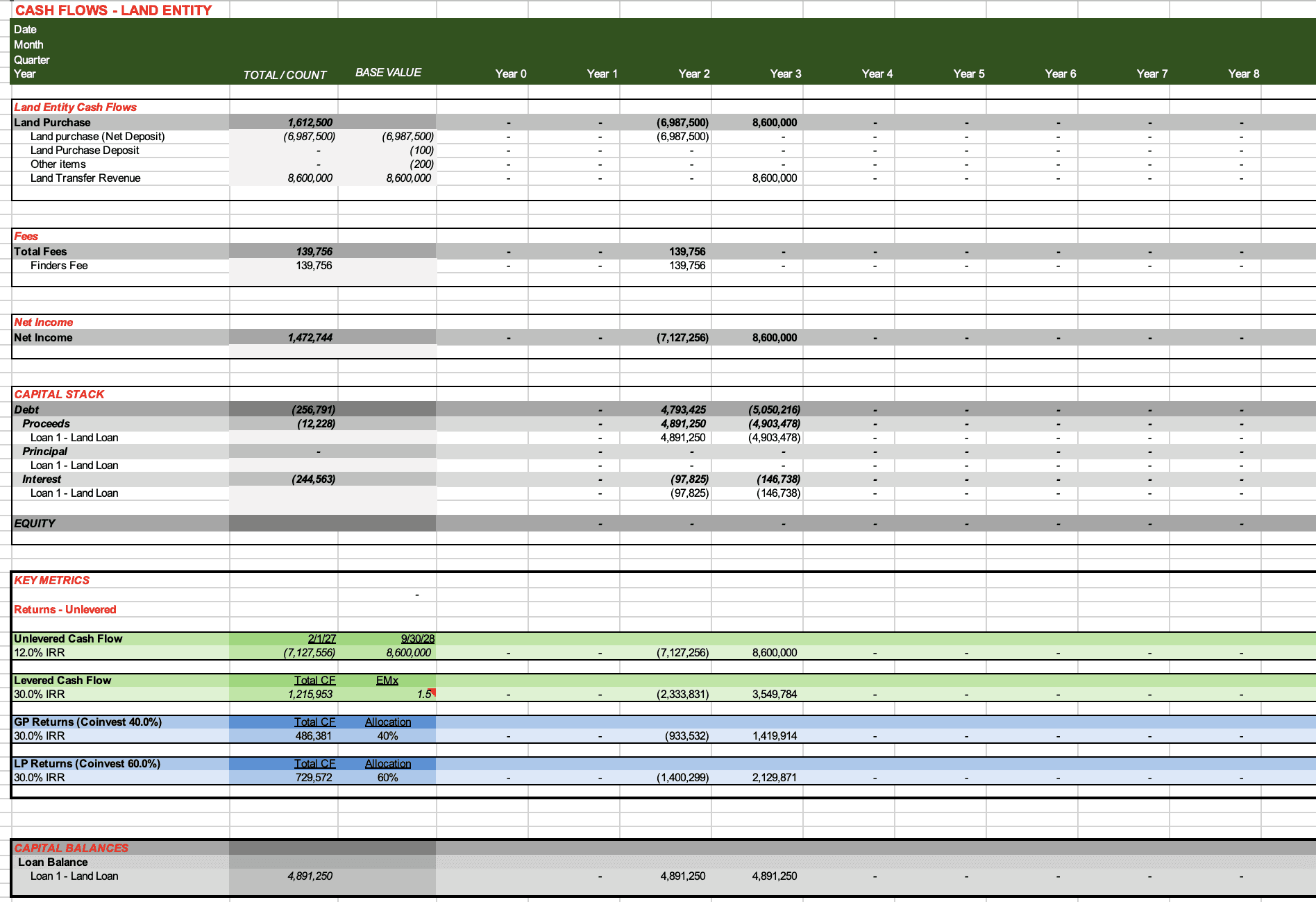 Evoludev's deal structure separates the land entity from the development entity — and the model reflects that precisely. The Land Entity cash flow operates as a fully independent proforma: the land is acquired, levered with its own financing, and transferred to the development entity at a point in time that is completely decoupled from joint venture formation. That flexibility matters because in practice, land transfers rarely align neatly with equity close dates.