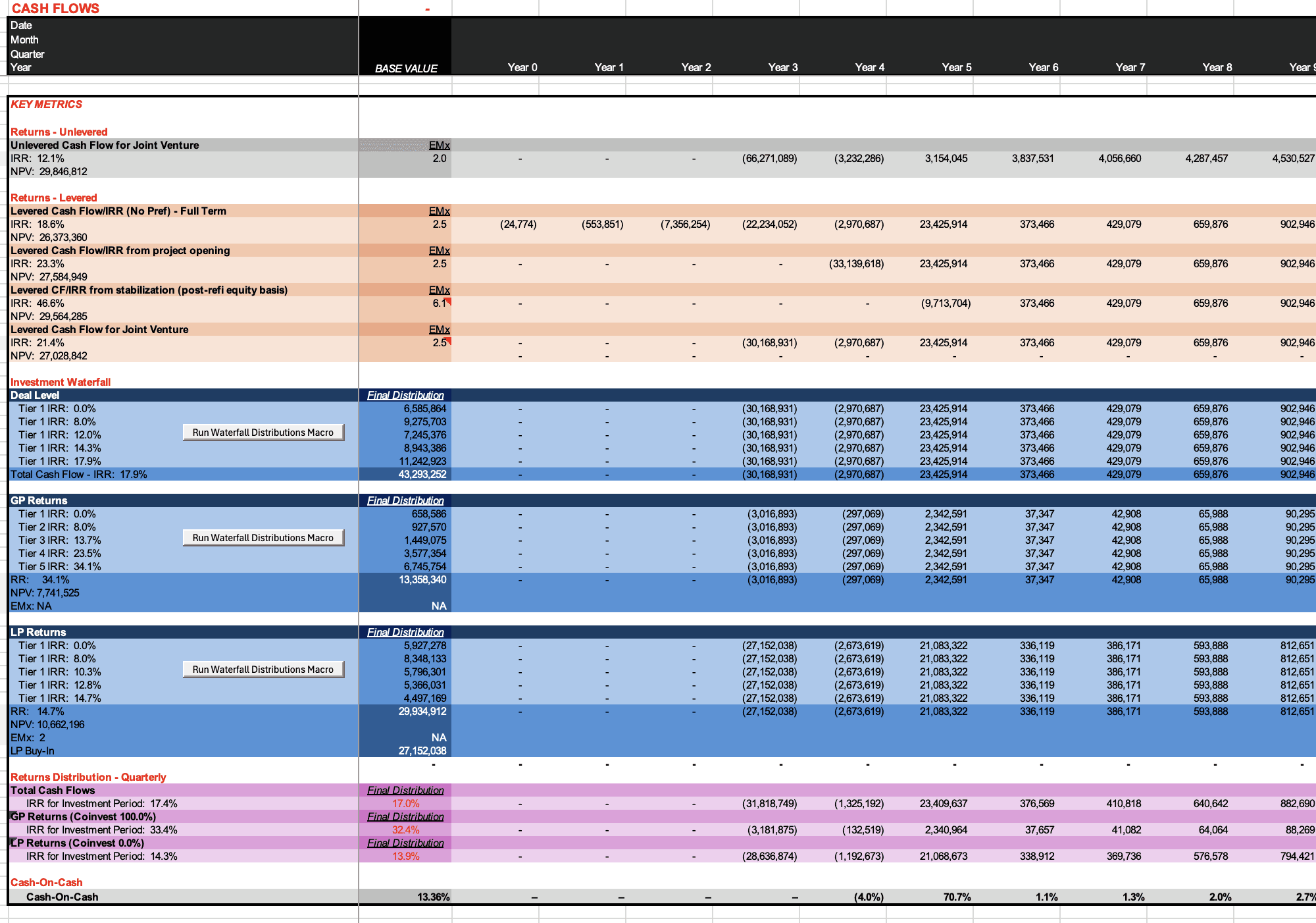 The Investment Waterfall is measured from JV inception, the only period for which it is relevant. Because IRR-driven promote structures carry a level of computational complexity that formula-based approaches handle poorly, the waterfall is macro-driven — but the outcome is not a black box. Distributions for each tier of the promote are run directly within the cash flow, period by period, at the Deal, GP, and LP level. Each tier shows the cash flow series, the IRR at that threshold, and the final distribution balance, giving any reviewer a clear, visual record of how partner distributions accumulate and how returns are attributed at each stage of the waterfall.