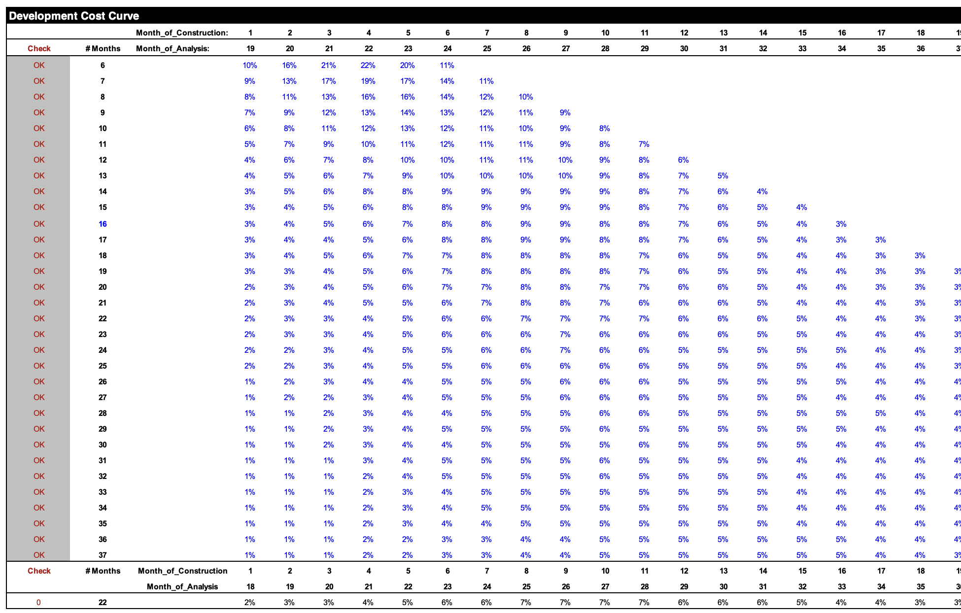 The Development Cost Curve, also located on this tab, translates hard costs into a non-linear monthly draw schedule that mirrors how construction capital actually moves — front-light, accelerating through the core build, and tapering at completion — and adjusts dynamically as construction duration changes. This makes the model immediately reusable across projects at different scales and stages.