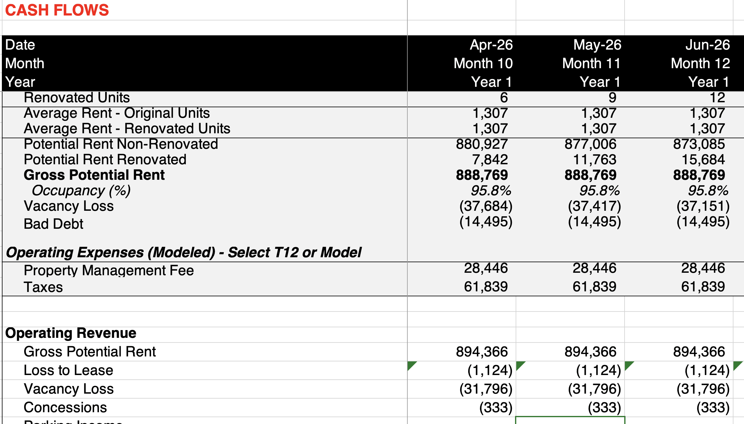 The renovation program is modeled the way lenders and investors expect to see it — each unit tracked through its renovation cycle, with the rent premium captured only once the work is done and the unit is back online. The cash flow statement makes the mechanics visible, simplifying the assumptions that drive the model and giving lenders and investors a clear, auditable path from renovation schedule to projected returns.