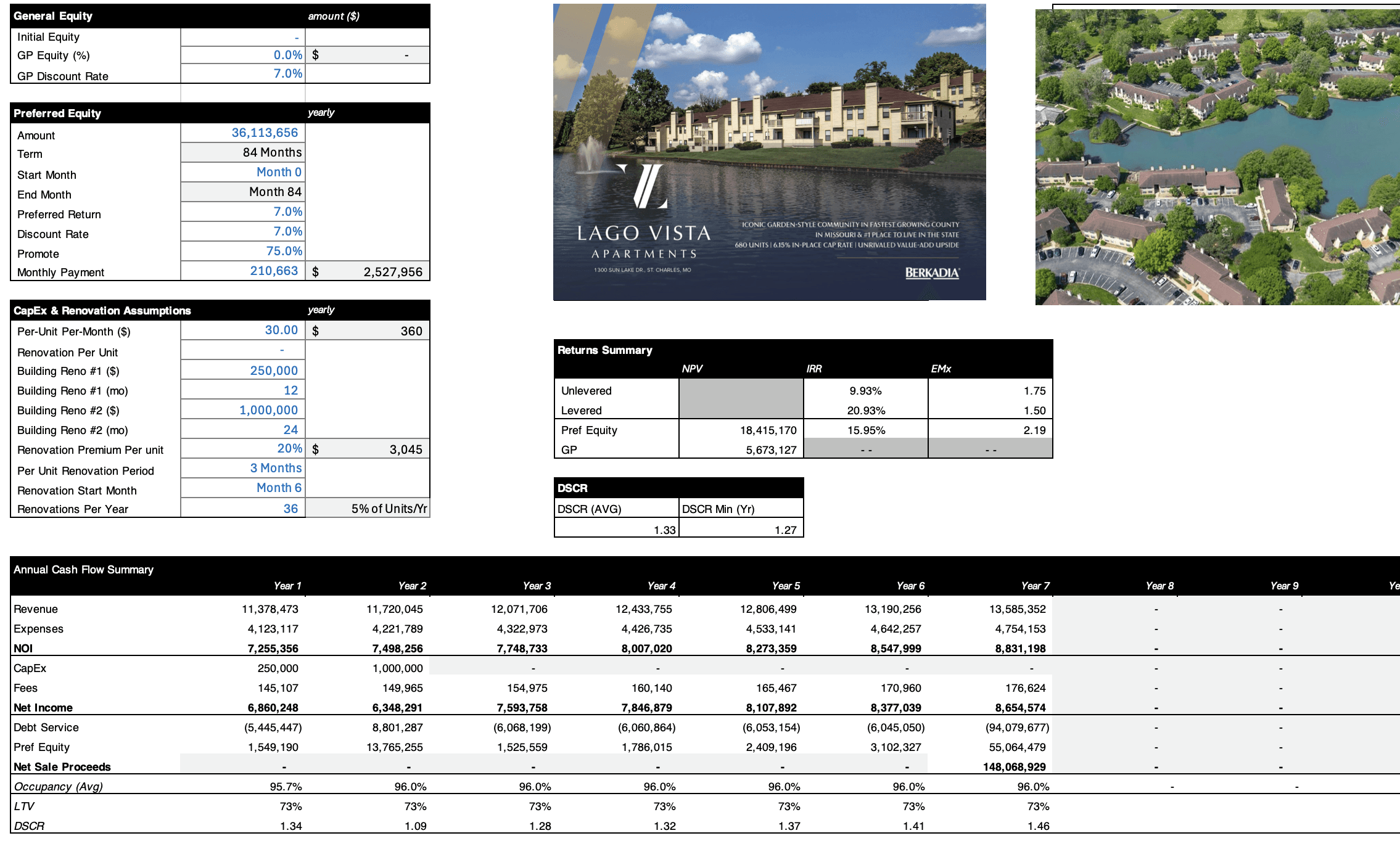 The deal had moving parts that generic models don't handle well: a phased unit renovation program, a floating-rate loan with an interest-only period, and a five-tier GP/LP promote waterfall. They needed everything integrated into a single, auditable file — not a patchwork of linked spreadsheets.
