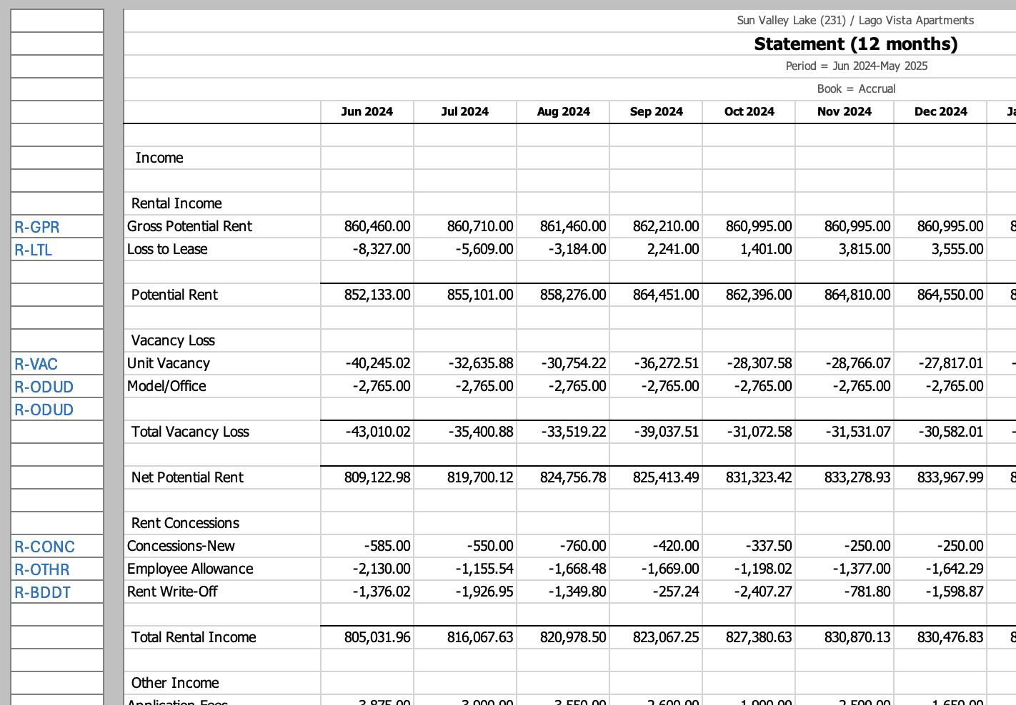 The model was built around T12 reconciliation as the foundation, with a clean separation between actuals and forward assumptions. Formatting conventions were applied throughout to support both formula-level auditing and visual review of the cash flow statement — so any LP or lender could open the file and orient themselves immediately.